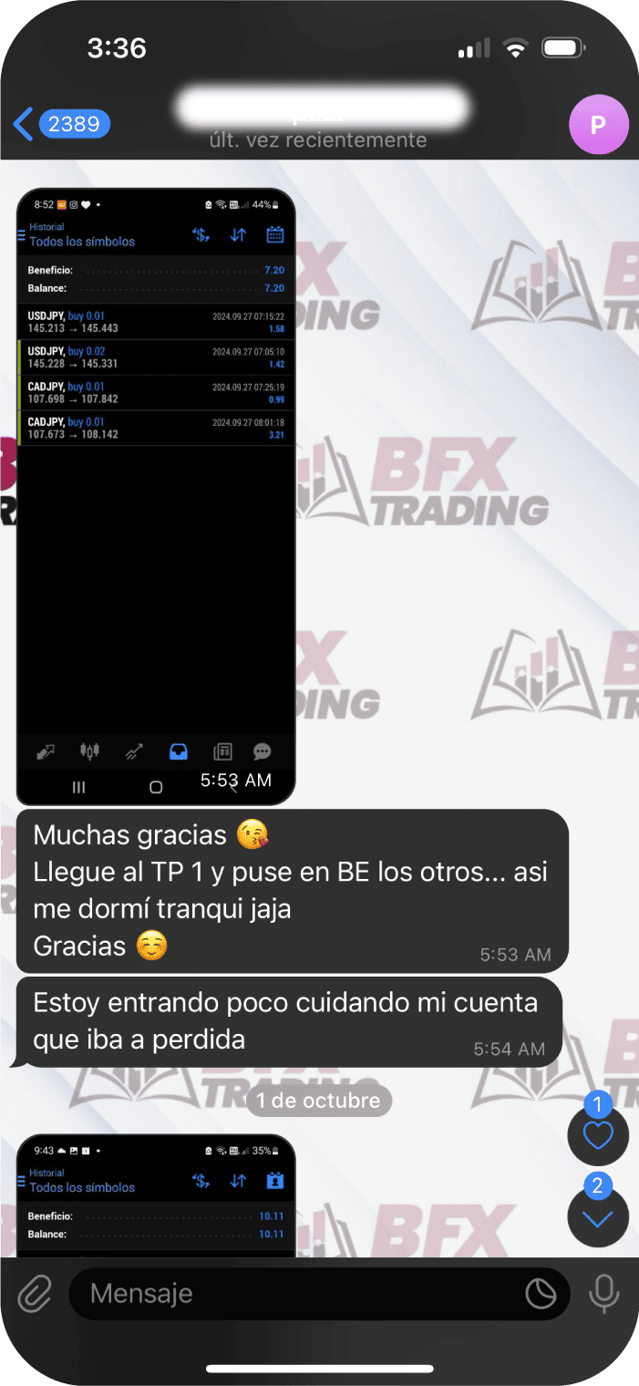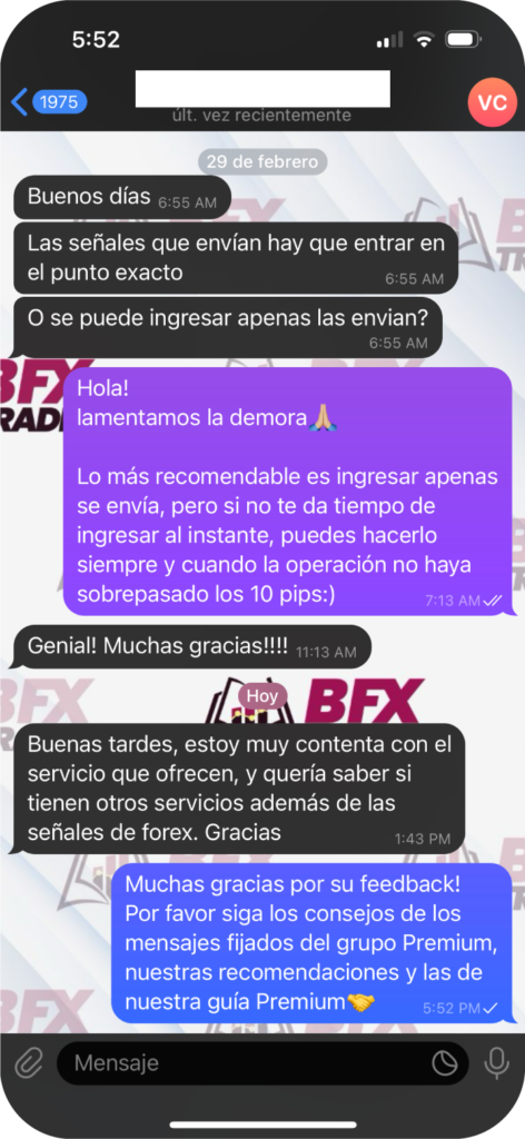 Recibirás entre 1 y 2 señales gratis cada día hábil (de lunes a viernes). Las señales incluyen punto de entrada, Take Profit y Stop Loss en pares principales y ocasionalmente oro.